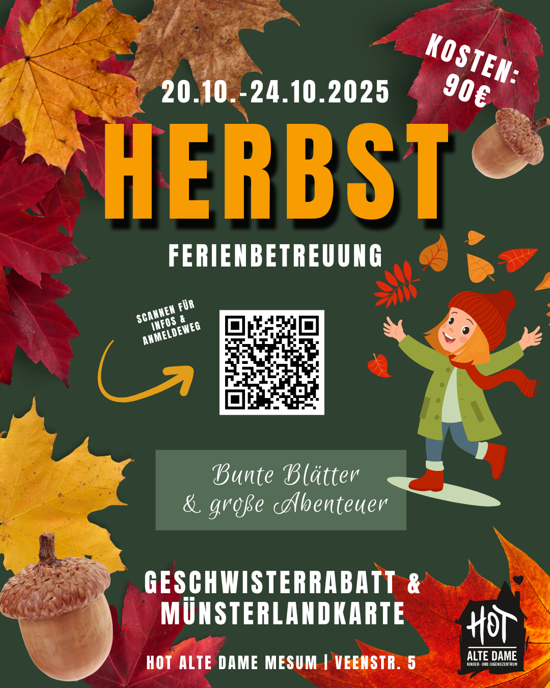 wir freuen uns, euch auch in diesem Jahr wieder unsere beliebte Herbstferienbetreuung anbieten zu können! Seit vielen Jahren organisieren wir in den Ferien eine ganztägige Betreuung für Grundschulkinder – und jedes Mal ist es für uns und die Kinder eine ganz besondere Zeit voller Spaß, Abenteuer und gemeinsamer Erlebnisse.